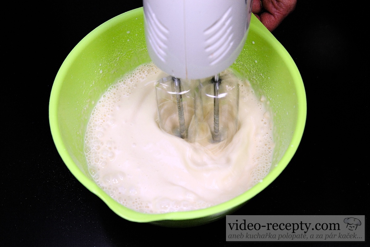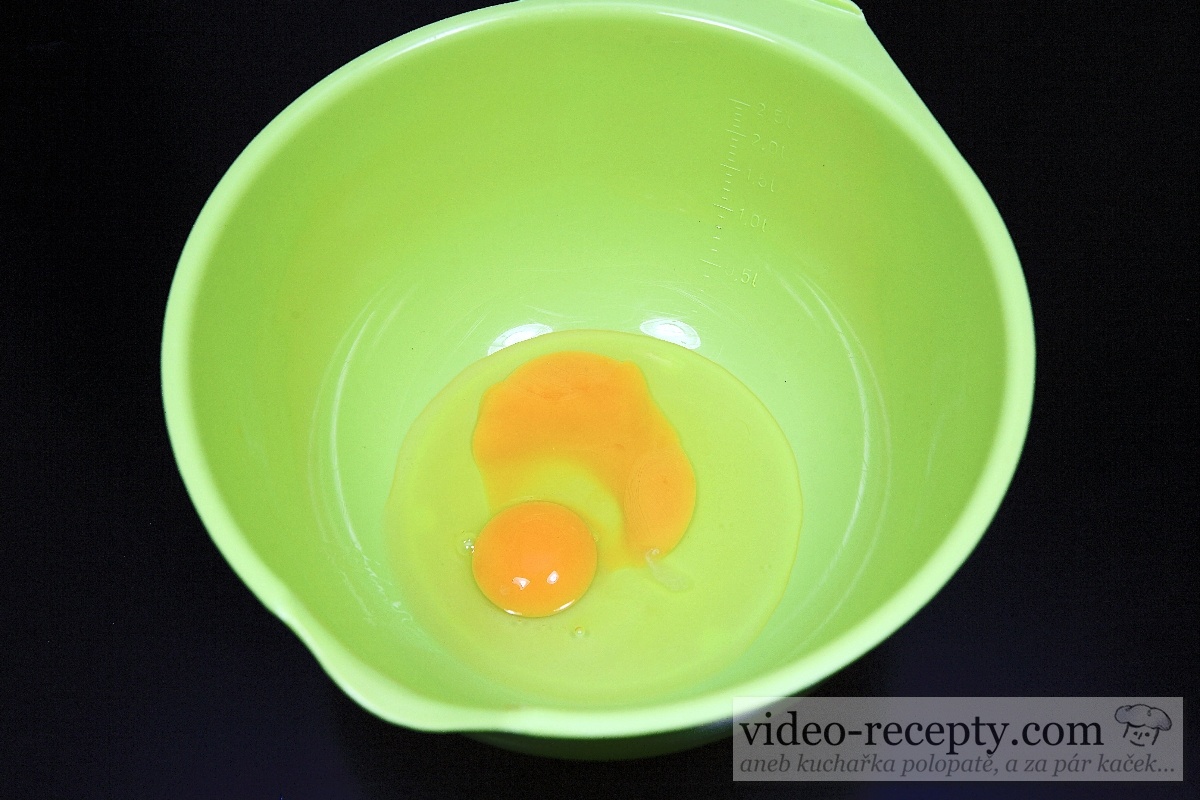 - Do vyššej misy rozklepneme dve vajcia, pridáme 1/2 lyžice cukru, 1/4 lyžičky soli, a asi minútu šľaháme. K tomu môže poslúžiť nielen mixer, ale aj obyčajná ručná metla.