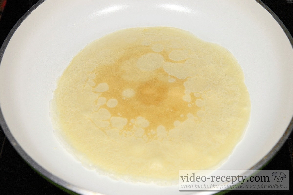 - Teraz nalejeme najlepšie naberačkou palacinkové cesto. Nakláňaním panvy ho rozlejeme po celej ploche a potom vyčkávame, až sa z palacinky odparí tekutina. Keď je odparená, tak počkáme ešte minútu, a potom palacinku otočíme.