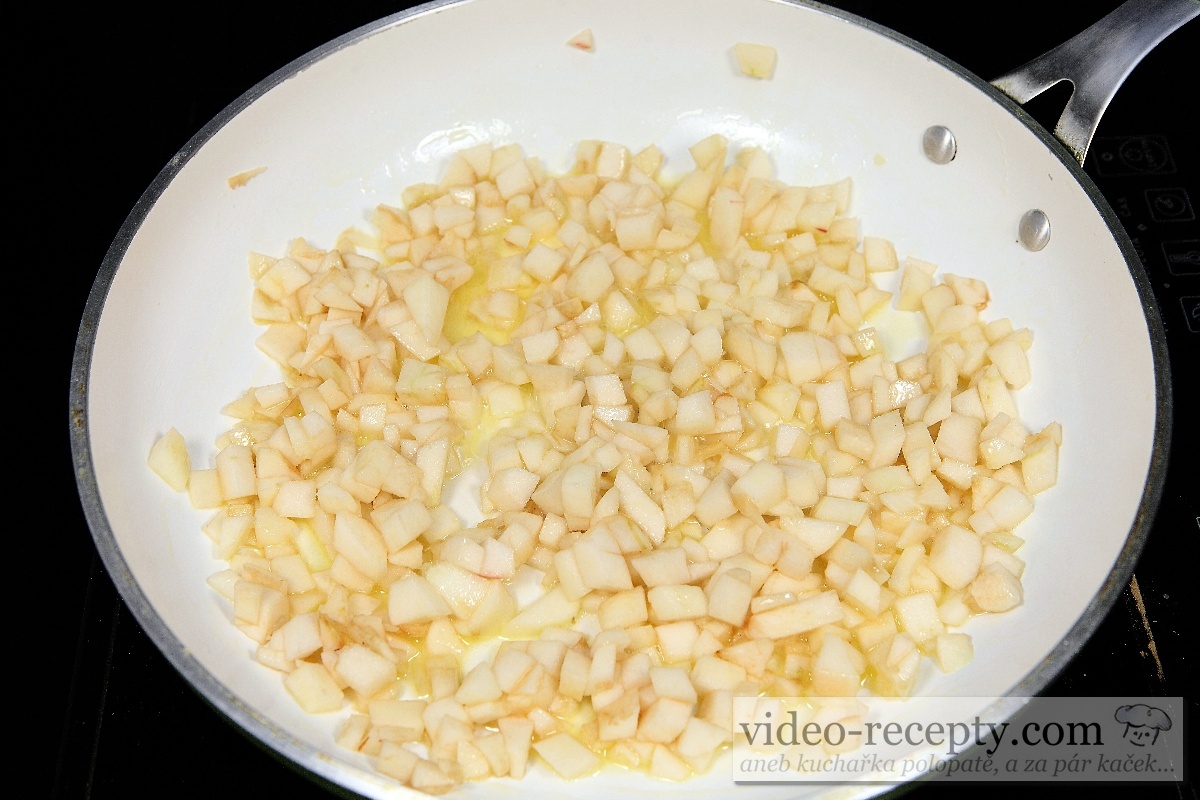 - Jablkový preliv vyrobíme tak, že na panvici rozohrejeme 40 gramov masla, prihodíme 200 gramov jabĺk nakrájaných na kocky a restujeme asi 3 minúty pri teplote okolo 100°C. Pridáme 2 lyžice cukru a restujeme, kým sa cukor nerozpustí. Potom pridáme 2 lyžice javorového sirupu, 1/4 lyžičky mletej škorice a miešame asi minútu.