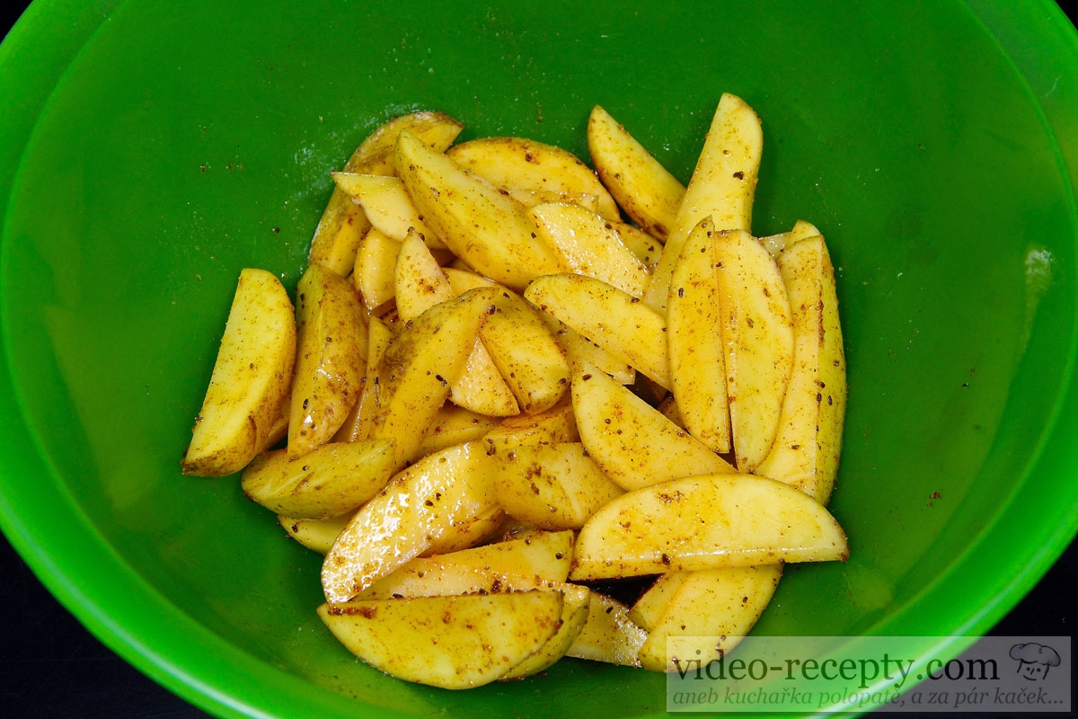 - Veľmi dobre umyté zemiaky nakrájame na mesiačiky a vložíme do väčšej misy.