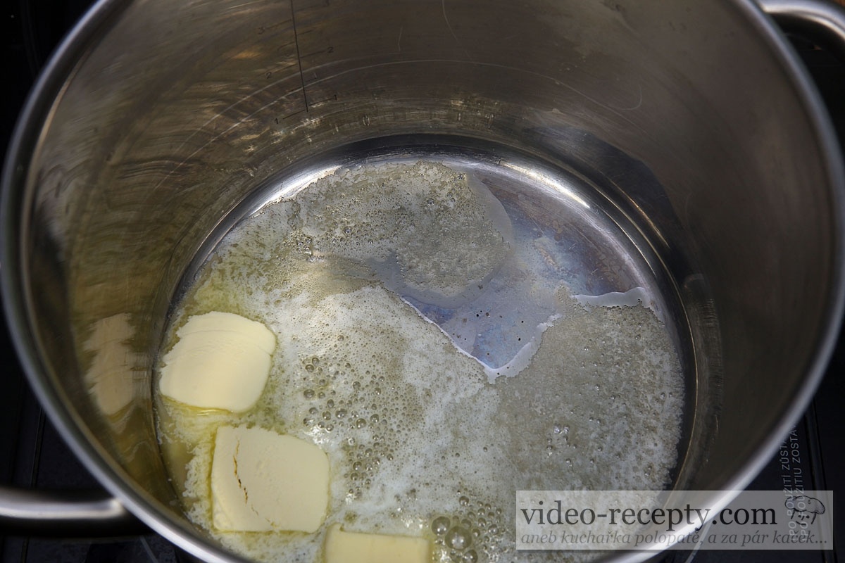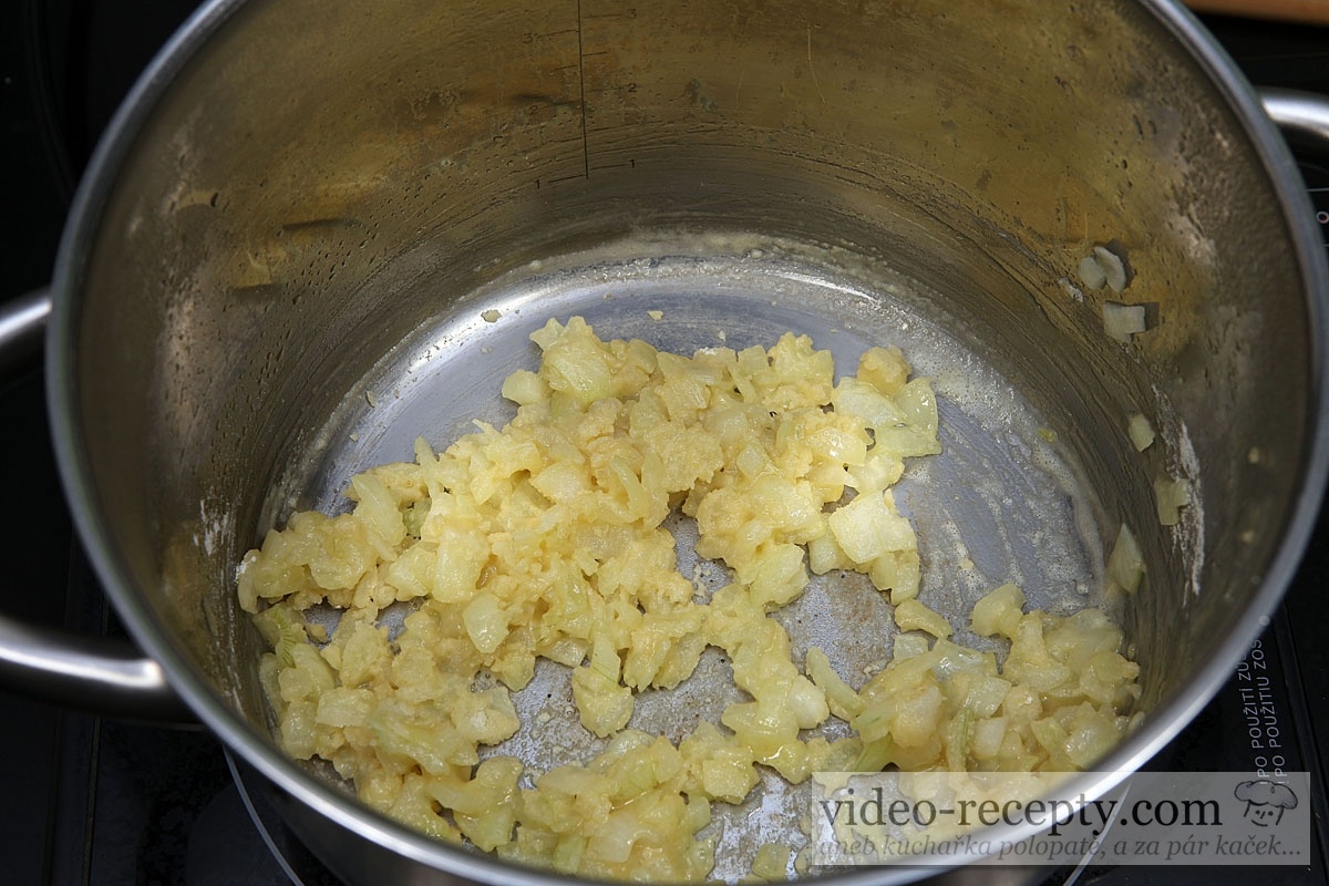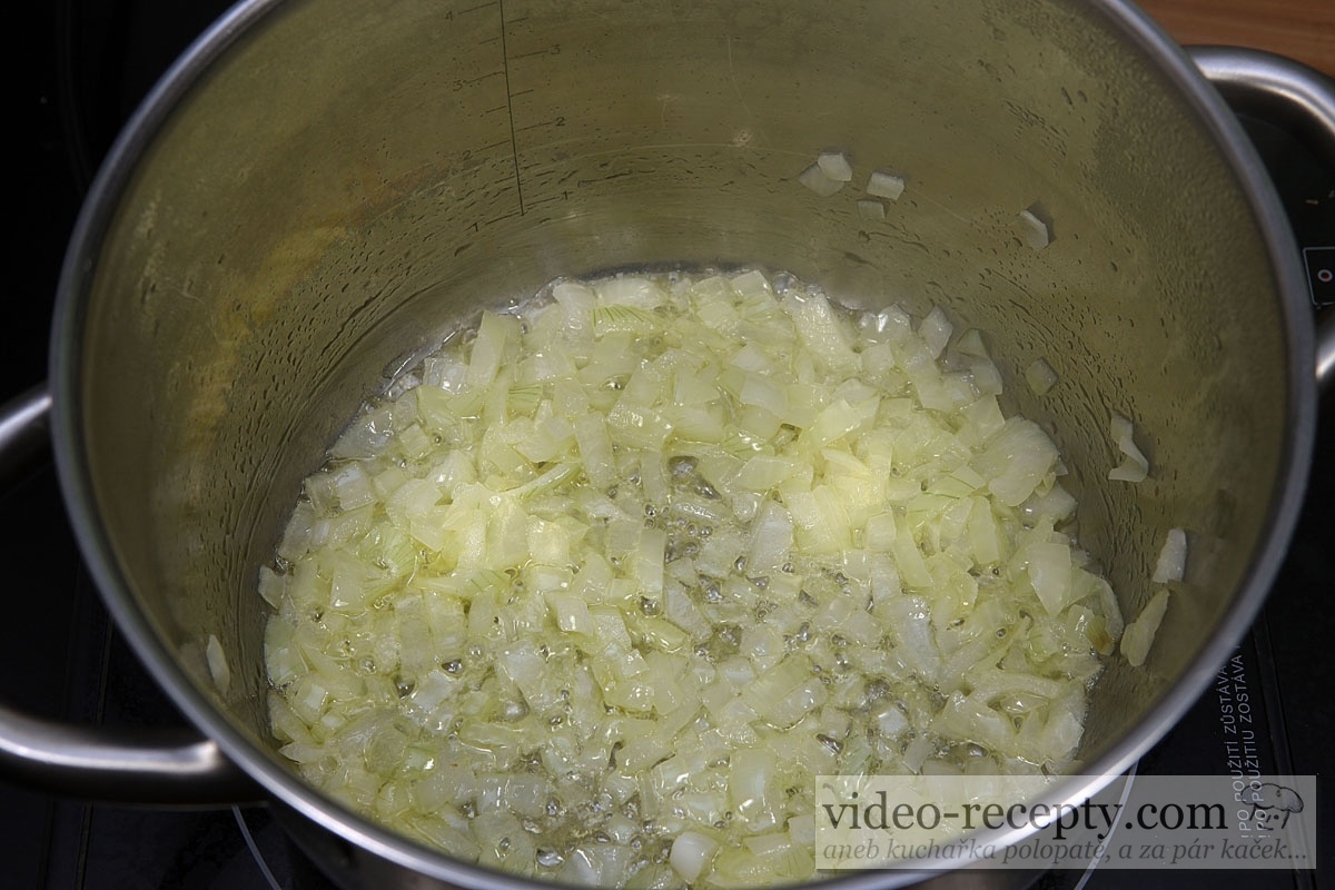 1. Kulajda sa sázenými vajcami zahájime rozpustením masla v päťlitrovom hrnci. Na ňom orestujeme veľkú cibuľu nakrájanú nadrobno.