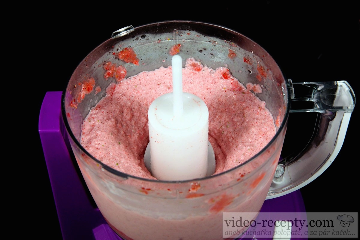 - Potom triešť zotrieme zo stien i z veka mixéra, pridáme cukor, šľahačku, studené mlieko a mixujeme asi 10 sekúnd.