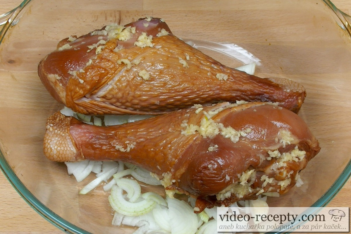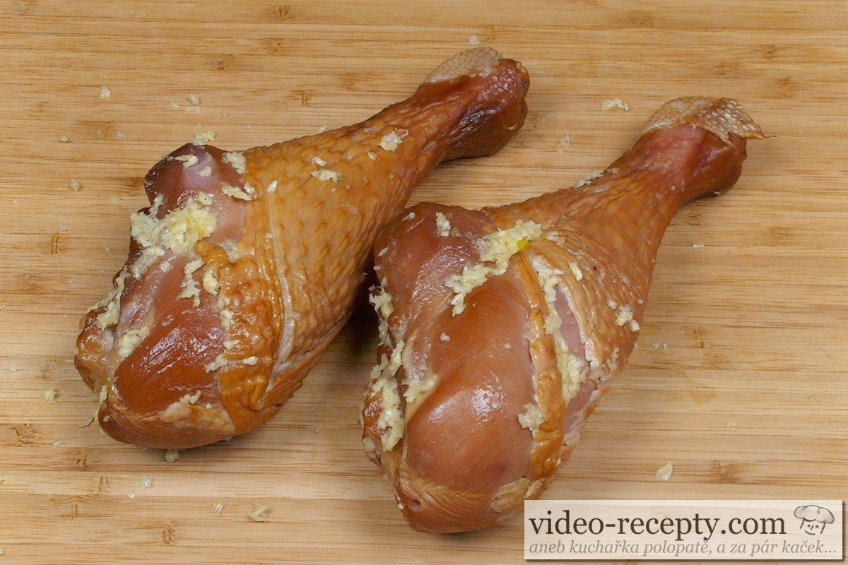 - Pečená údená morčacie stehná zahájime narezaním stehien rovnako ako na videu. Tento krok robíme preto, aby sa cesnak dostal aj do spodnejších vrstiev mäsa pod údenú kožu.