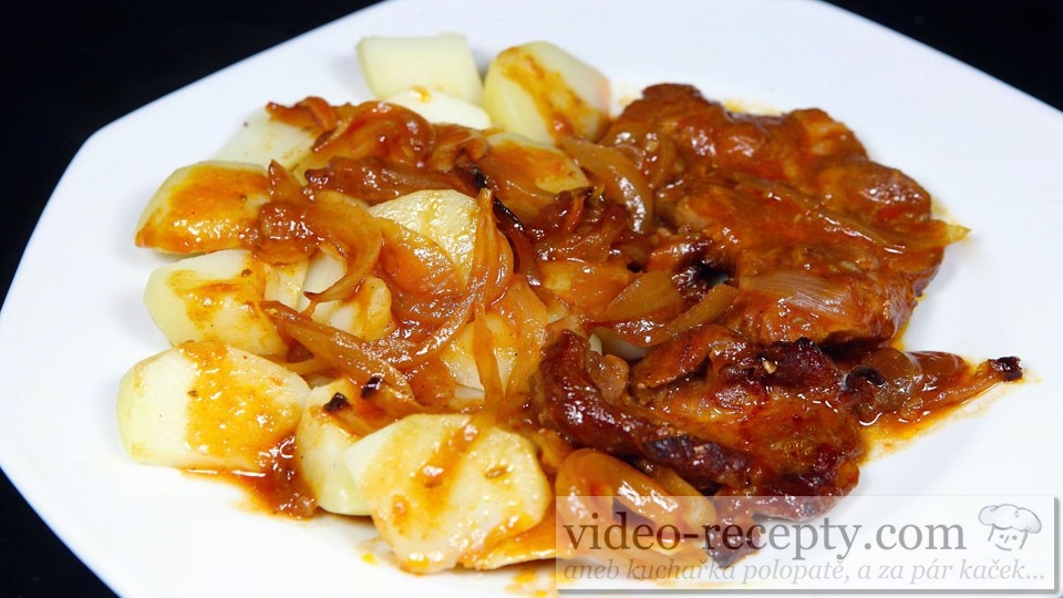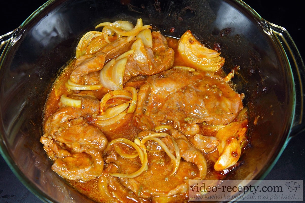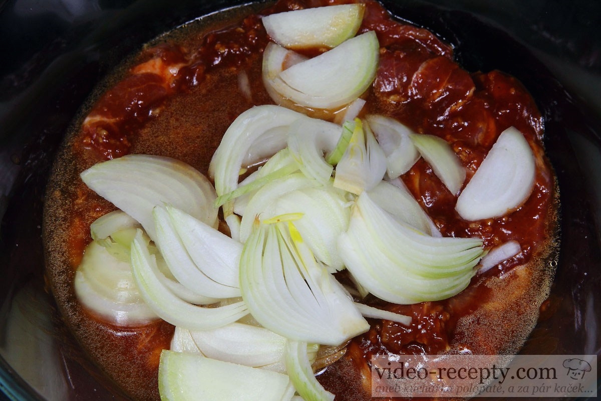 - Marinádu nalejeme na krkovičku, prilejeme 50 ml vody a pridáme veľkú cibuľu nakrájanú na polmesiačiky.