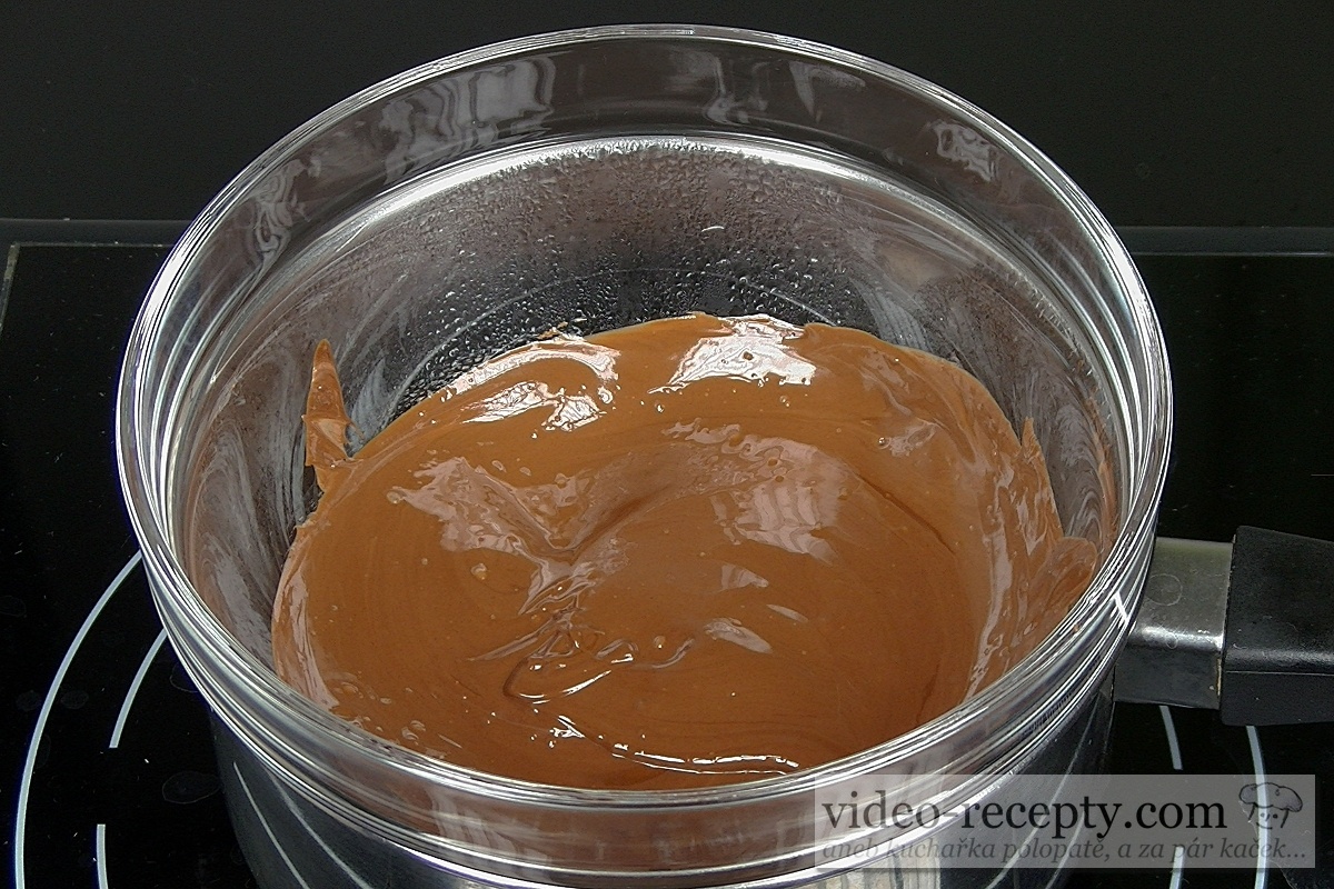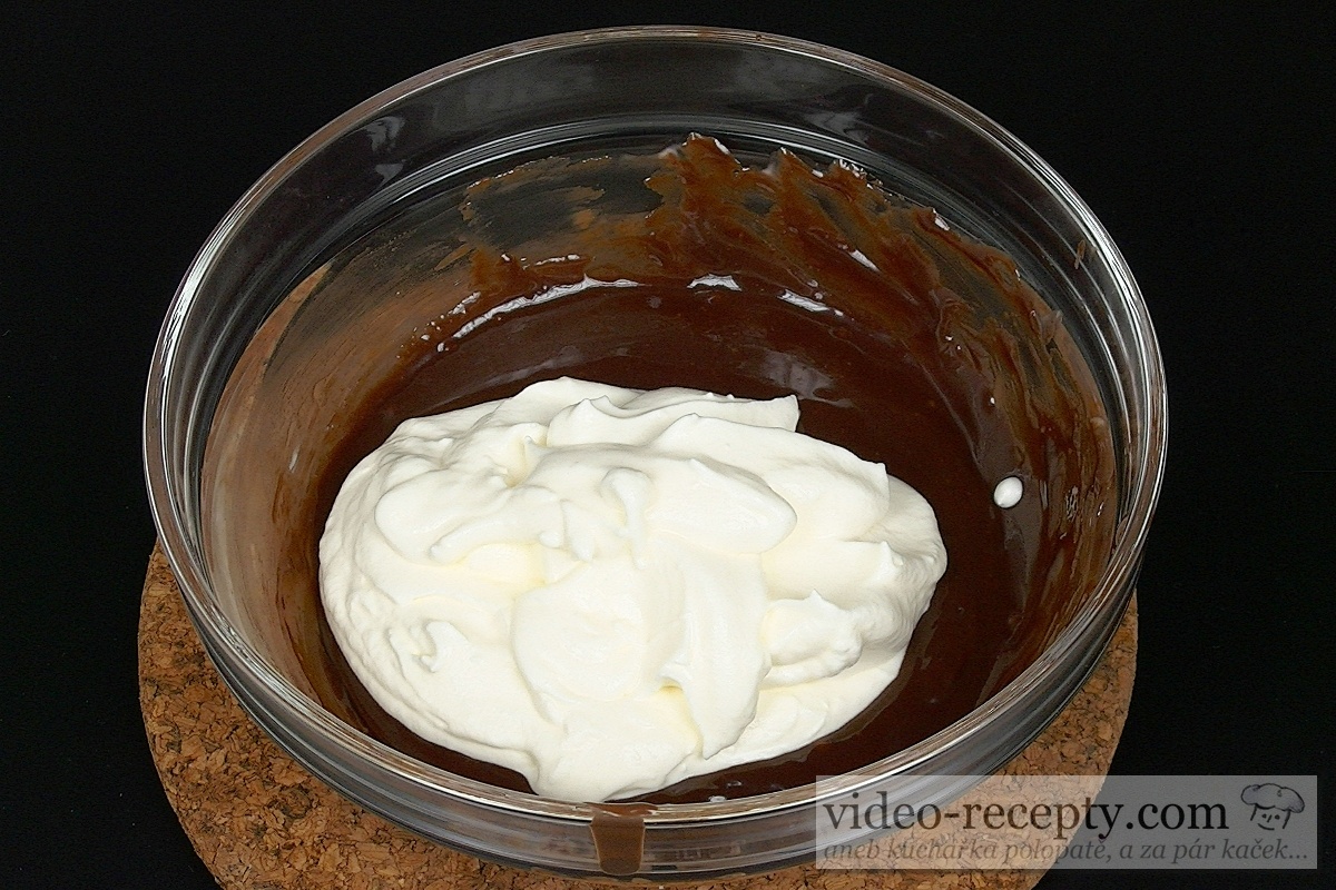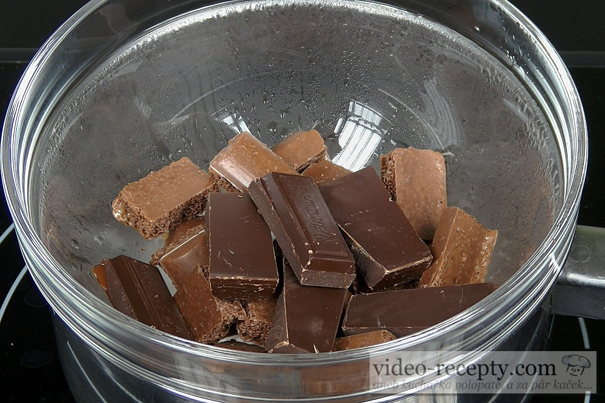 {text:"Vodný kúpeľ vyrobíme tak, že do menšieho hrnca dáme vodu, ktorú varíme. Miesto pokrievky dáme misu, ktorá sa unikajúci parou zahrieva. Tým dosiahneme to, že sa potraviny v mise nebudú páliť."}Celkovo jej potrebujeme okolo 120 gramov, najvhodnejšie je pomer 1: 1, teda 60 gramov mliečnej a 60 gramov horkej.{text:"Ak máte radšej horkú čokoládu, potom mliečne dajte len 30 gramov, a horkej 90 gramov. Ak máte radšej mliečnu, urobte to obrátene."}Keď je čokoláda rozpustená, tak varič vypneme a čokoládu necháme vychladnúť asi na teplotu 35 ° C. Dôležité je, aby sa v čokoláde rozpustili naozaj všetky kúsky. - V samostatnej miske ušľaháme dva bielky do snehu, a potom pridáme 2 lyžičky práškového cukru.